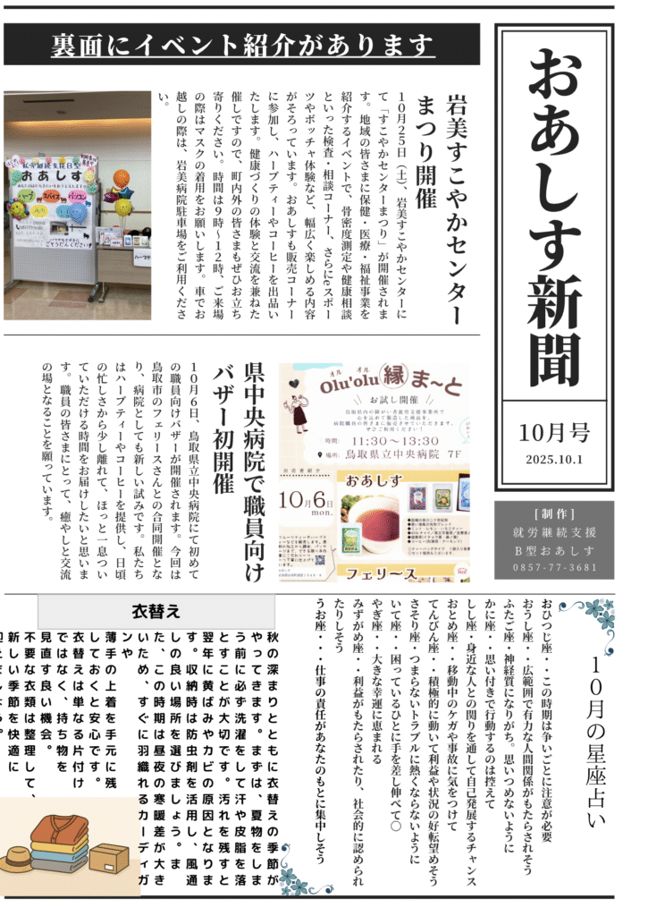 10月6日、鳥取県立中央病院にて初めての職員向けバザーが開催されます。今回は鳥取市のフェリースさんとの合同開催となり、病院としても新しい試みです。