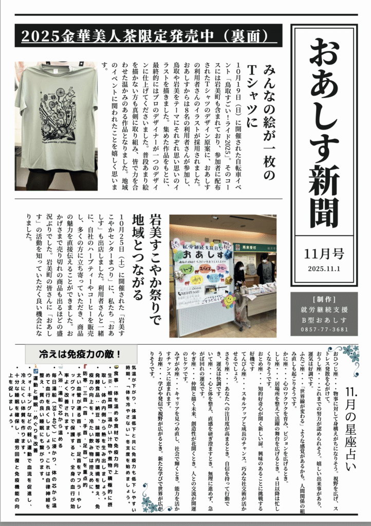 10月25日(土)に開催された「岩美すこやかセンターまつり」に、私たち「おあしす」も出店しました。利用者さんと一緒に、自社のハーブティーやコーヒーを販売し、多くの方に立ち寄っていただき、商品の魅力を直接伝えることができました。おかげさまで売り切れの商品も出るほどの盛況ぶりでした。岩美町の皆さんに「おあしす」の活動を知っていただく良い機会になりました。