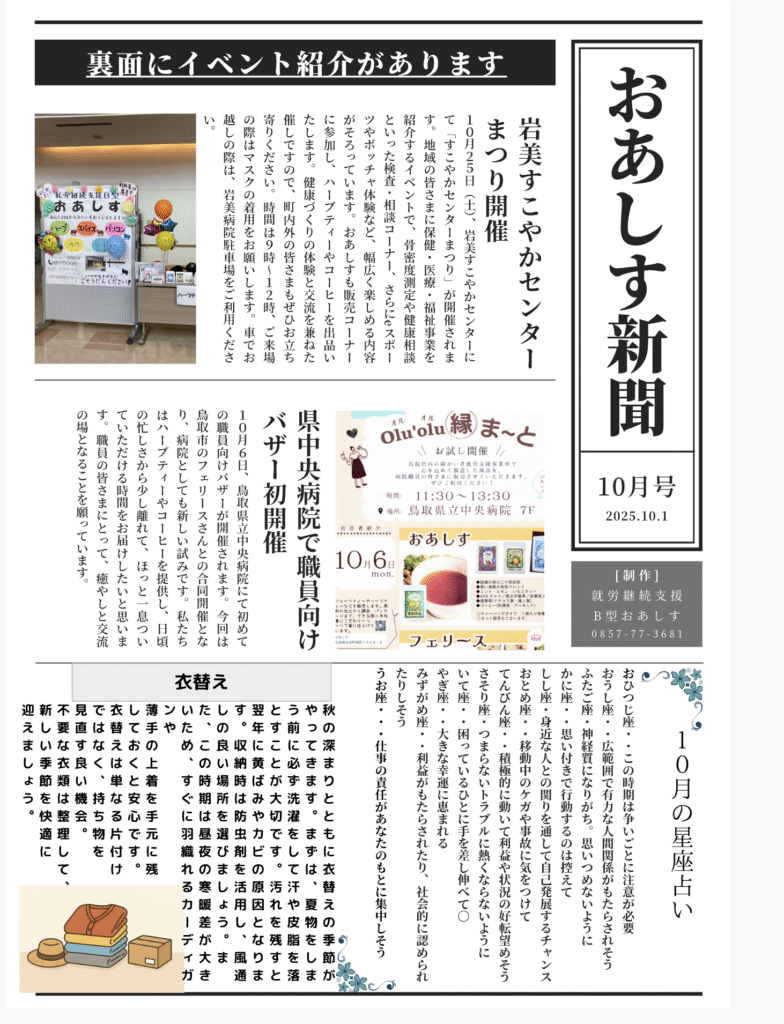 10月25日(土)、岩美すこやかセンターにて「すこやかセンターまつり」が開催されます。地域の皆さまに保健・医療・福祉事業を紹介するイベントで、骨密度測定や健康相談といった検査・相談コーナー、さらにeスポーツやボッチャ体験など、幅広く楽しめる内容がそろっています。おあしすも販売コーナーに参加し、ハーブティーやコーヒーを出品いたします。健康づくりの体験と交流を兼ねた催しですので、町内外の皆さまもぜひお立ち寄りください。時間は9時〜12時、ご来場の際はマスクの着用をお願いします。車でお越しの際は、岩美病院駐車場をご利用ください。